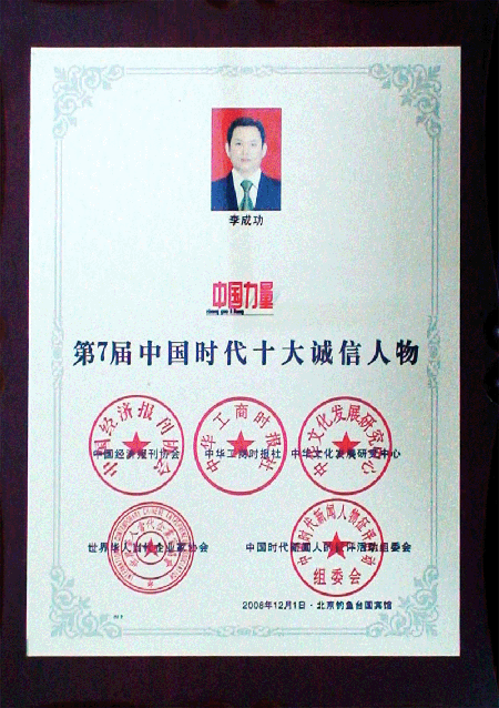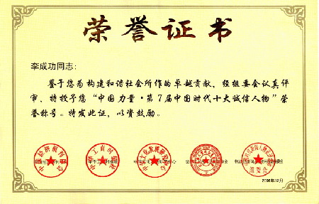 總裁李成功先生當(dāng)選為中國力量第七屆中國時(shí)代十大誠信人物
