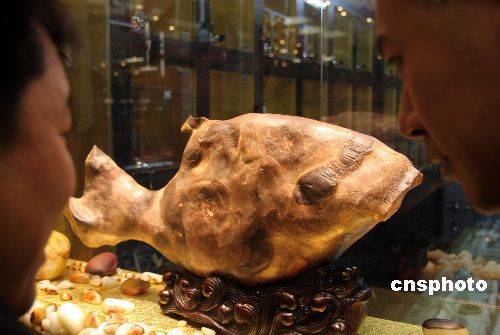 近日,北京愛家國際收藏品交流市場的一商戶,展出一款來自新疆天山南部一干枯的湖底中發(fā)現(xiàn)的形似“魚”的罕見天然五彩奇石,形象逼真、色彩斑瀾,長72.8cm、高33cm,重達(dá)20多公斤。此石被專家們譽(yù)為天下第一奇石,其價(jià)值約億元人民幣。展出3天以來,吸引了不少中外收藏愛好者。
