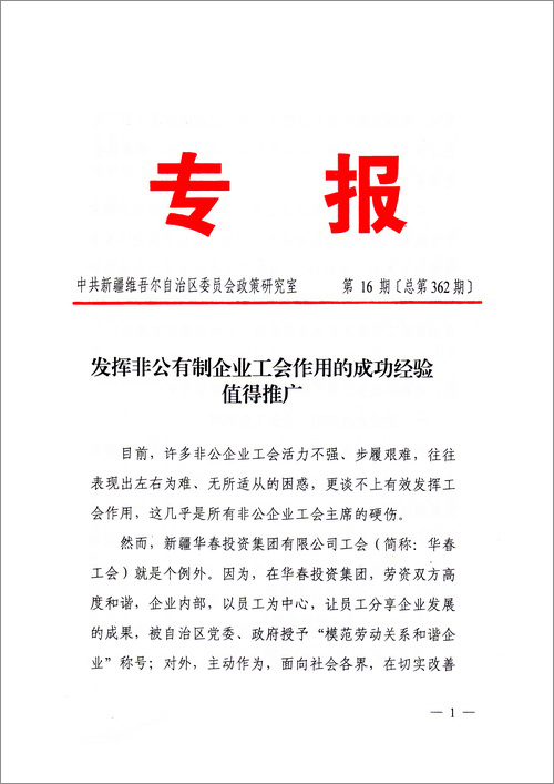 近日,自治區黨委政研室對新疆華春投資集團工會委員會的典型成功經驗進行了深入調研,發了題為《發揮非公有制企業工會作用的成功經驗值得推廣》的專報。結論是:新疆華春工會的實踐證明,非公企業工會有干不完的工作,不是可有可無,而是大有可為!這是在自治區黨委這個層面上,首次對全疆非公有制企業工會的肯定。
