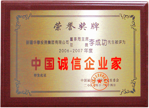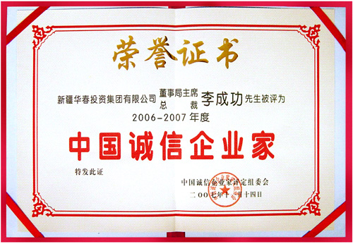 新疆華春集團(tuán)總裁李成功先生經(jīng)中國(guó)誠(chéng)信企業(yè)家評(píng)定組委會(huì)的初審、復(fù)審及公示,被評(píng)為2006-2007年度中國(guó)誠(chéng)信企業(yè)家,于2008年剛剛開啟之際,為李成功先生頒發(fā)了榮譽(yù)證書和獎(jiǎng)牌。