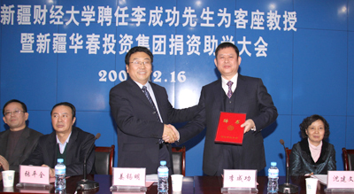 儀式上,華春投資集團為新疆財大工商管理學院捐助了10臺筆記本電腦。李成功先生說,接過這個教授聘書,覺得沉甸甸的,這不僅僅是一份聘書,而是一份對教育事業盡力的社會責任。華春投資集團還將于2010年開始在5年時間內,對新疆財經大學50名家境貧寒的學生每人資助3000元、50名品學兼優的學生每人資助5000元,還準備為該?;I建一座教學樓。作為新疆財經大學的客座教授,有責任為我們新疆財經大學的教書育人事業貢獻一份心力。