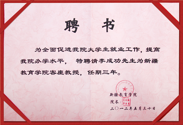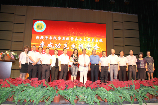 2012年5月30日下午,新疆教育學(xué)院學(xué)術(shù)報告廳座無虛席,新疆華春投資集團(tuán)有限公司董事局主席兼總裁李成功先生“客座教授”受聘儀式暨報告會在這里隆重舉行。該院的主要領(lǐng)導(dǎo)與數(shù)百名應(yīng)屆畢業(yè)生參加了報告會,新疆華春投資集團(tuán)的董事王春容女士和集團(tuán)人力資源、行政、企劃、培訓(xùn)、工會、黨委等部門的負(fù)責(zé)人參加了此次活動。