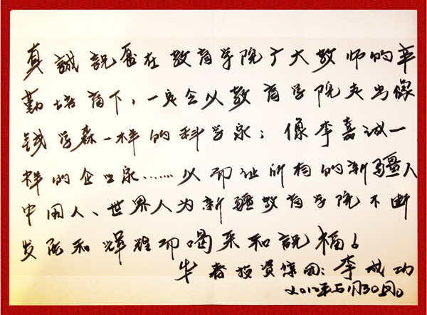 報告會結(jié)束后,李成功總裁一行參觀了新疆教育學(xué)院發(fā)展史陳列室,并為該學(xué)院題辭。