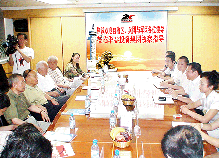 6月5日上午,新疆國(guó)際國(guó)內(nèi)公共關(guān)系協(xié)會(huì)考察團(tuán)前往中國(guó)優(yōu)秀企業(yè)——新疆華春投資集團(tuán)進(jìn)行考察、調(diào)研。考察團(tuán)由自治區(qū)黨委原副書(shū)記張思學(xué)、原蘭州軍區(qū)副政委、新疆軍區(qū)政委唐廣才、新疆生產(chǎn)建設(shè)兵團(tuán)原政委郭剛、新疆生產(chǎn)建設(shè)兵團(tuán)原司令員劉雙全和自治區(qū)招商發(fā)展局武茂雄處長(zhǎng)組成。