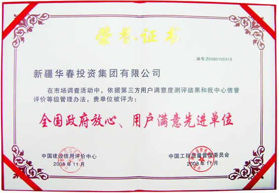 “全國政府放心、用戶滿意先進(jìn)單位”榮譽(yù)證書